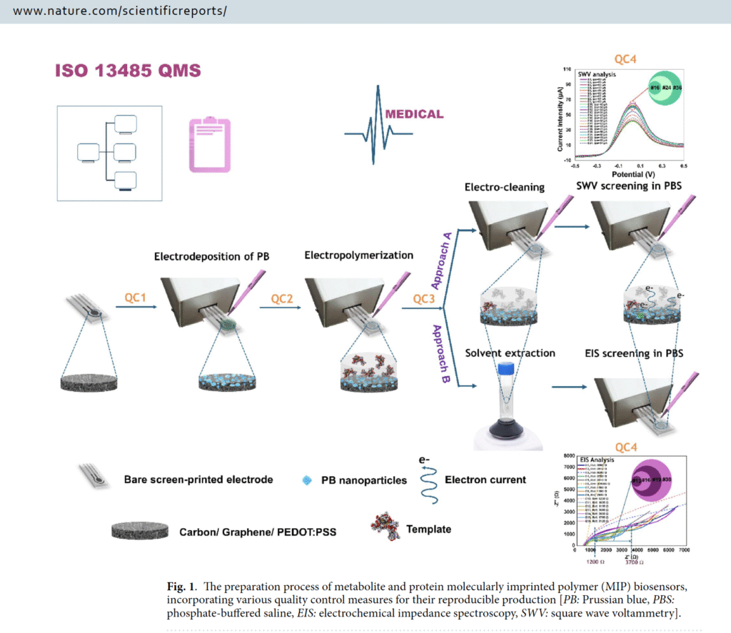 We developed an innovative quality control (QC) strategy to ensure highly reproducible molecularly imprinted polymer (MIP) biosensors, overcoming one of the biggest challenges in biosensor manufacturing. By embedding Prussian Blue nanoparticles (PB NPs) within the MIP structure and monitoring electrochemical signals during fabrication, this approach enables real-time, non-destructive QC of key parameters like film thickness, conductivity, and template extraction efficiency. Applied to biosensors for agmatine and GFAP, the method reduced variability by up to 87% and significantly improved detection success rates compared to conventional approaches. This breakthrough integrates QC directly into the fabrication process, delivering unprecedented reproducibility, scalability, and reliability for next-generation point-of-care diagnostics and commercial applications.